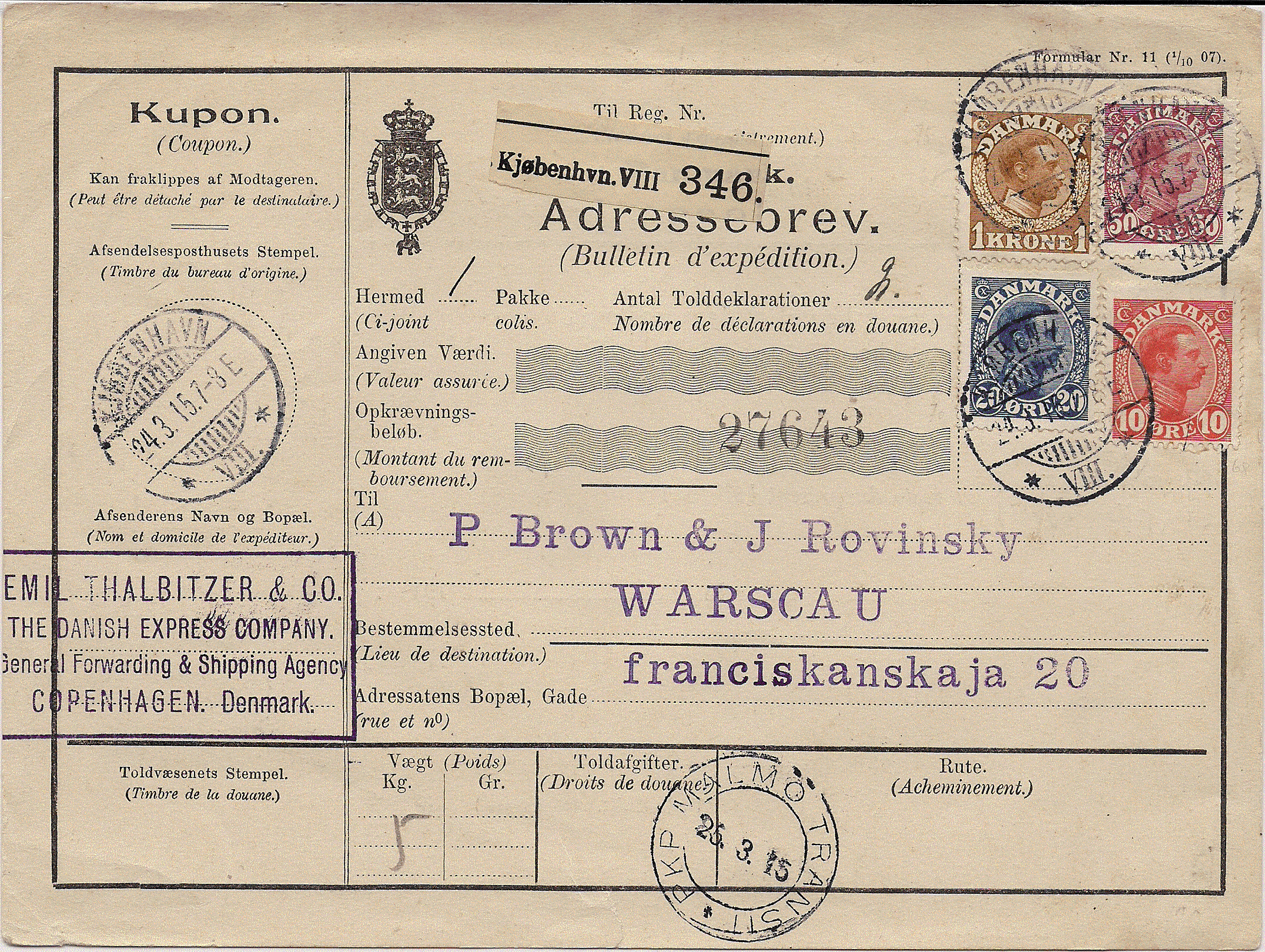 igen et spoergsmaal om postforbindelser med Rusland i 1. verdenskrigen. Jeg har et adressekort, der blev sendt marts 1915 fra Koebenhavn via Sverige og Finland til Warszawa (Russisk Polen). Warszawa paa davaerrende tidspunkt stadig var i russiske haender, men fronten var ikke langt vaek.nIngen censur notat (er der noget om et adressekort at censurere alt for?), men transit stempler af Malmö og Helsinki.