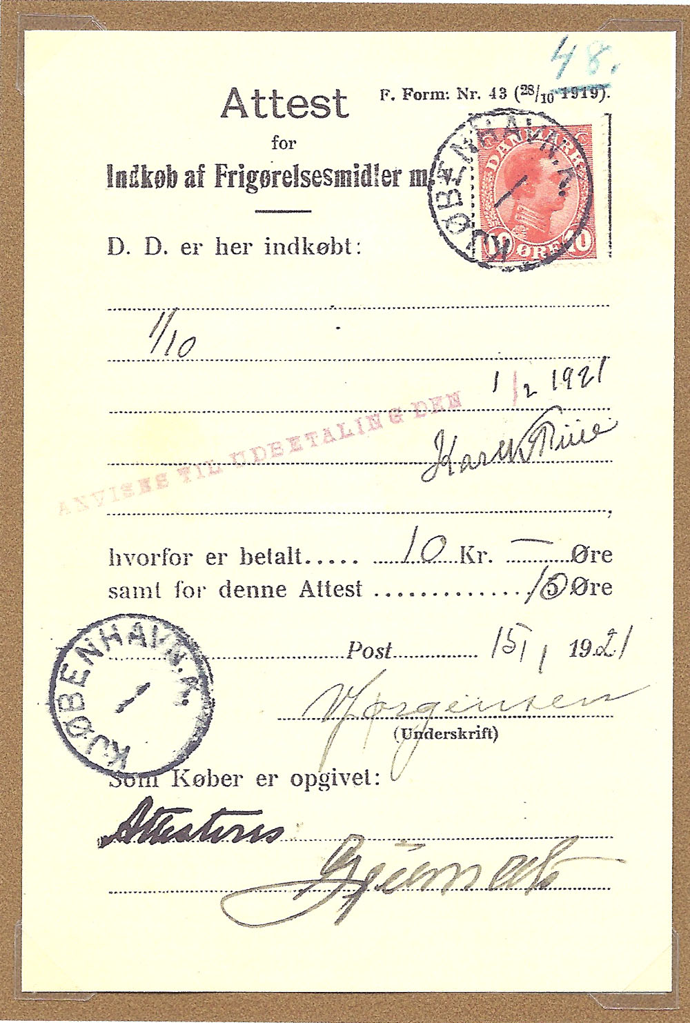 Attest for Indkøb af Frigørelsesmidler m.v. frank med afa 69, annul med Kbh K. uden dato og tidsang.