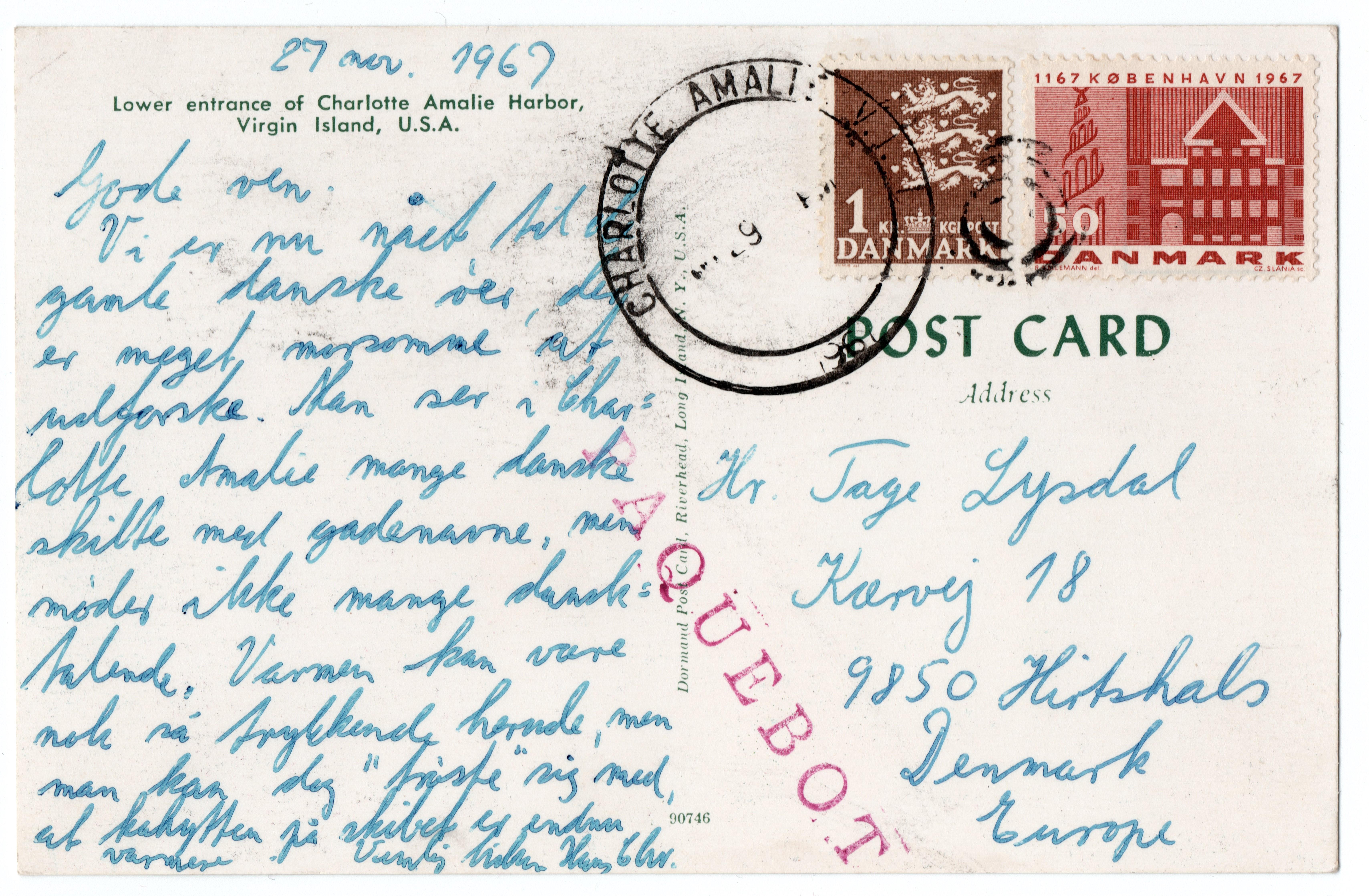 Eet Paquebot postkort fra Charlotte Amalie sendt i 1967