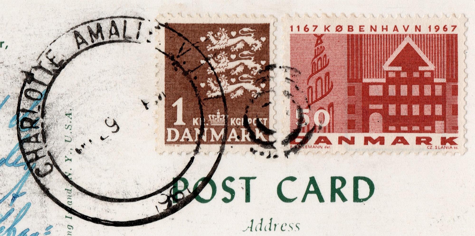 Nu er 1967 jo 50-året for salget af DVI-øerne, så det er vel tænkeligt, at der blev anvendt et særligt ‘jubilæumsstempel’ i den anledning f.eks. på skibet, som så har afleveret brevet til det lokale postvæsen ved ankomsten til Charlotte Amalie. Blot en teori, for jeg har ikke kunnet Google mig til noget brugbart, ud over at der på øerne blev afholdt selskaber, og at der i den forbindelse blev lavet filatelistiske produkter til salg. Det finder man bl.a. HER  (eller en oversigt over 1967-emner HER)