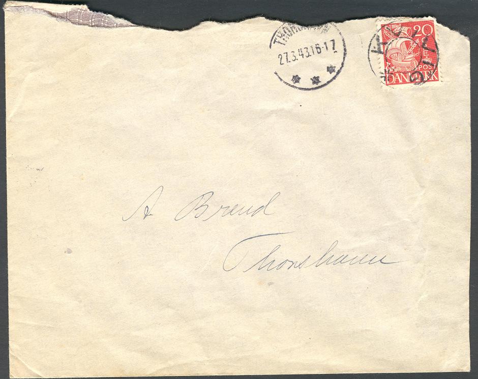 På baksidan av brevet är det på nytt frankerat med Karavel 20 öre och avsänt den 29 mars 1943 till köbmand Jacob Hansen i Kvivik!