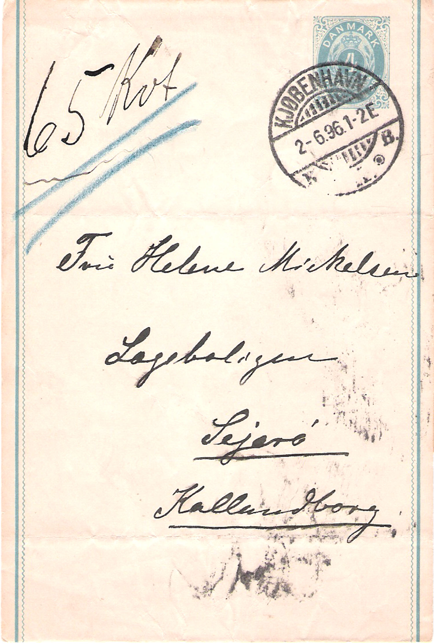 XB 2b sendt fra Kbh til Sejerø 1896, vægtang 65 kvt med understregning i blåt, meget alvorlig. Har her overskredet de reglementerede 250 gram (1 kvt can5 gram, så 5 x 65= 325 gram. Hvad gør man så udover en alvorlig understregning?? XB’et er afstemplet 2-6.96.1-2 E med et “kassetømningsstempel” under K.På bagsiden et bro Vi samme dato.