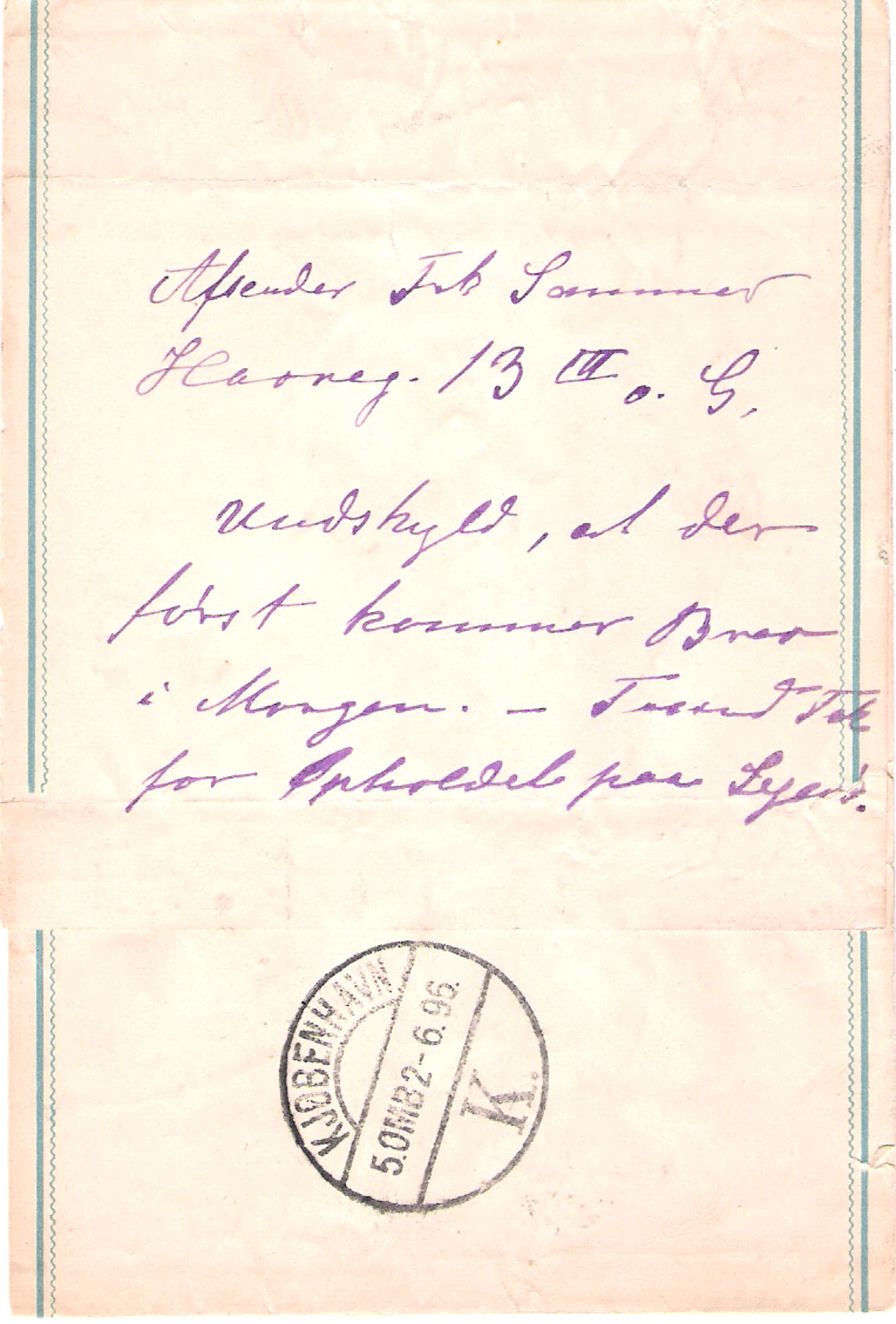 Heldigvis har afsenderen været så “fornuftig” at angive navn og bopæl bagpå samt en lille takkeskrivelse for opholdet på Sejerø. Dette var heller ikke helt reglementeret, så min påstand er, at man har trådt i karakter og båret hele molevitten ud til Frk Sommer med 5.omb samme dag. Xb’et er efter min bedste overbevisning IKKE BLEVET SENDT TIL SEJERØ. Hvad havde man gjort, hvis Frk Sommer ikke havde skrevet navn og adrs. på båndet??? Det var jo overvægtig. Var modtageren blevet sat i porto, og hvormeget???? 4 øre, 8 øre eller????